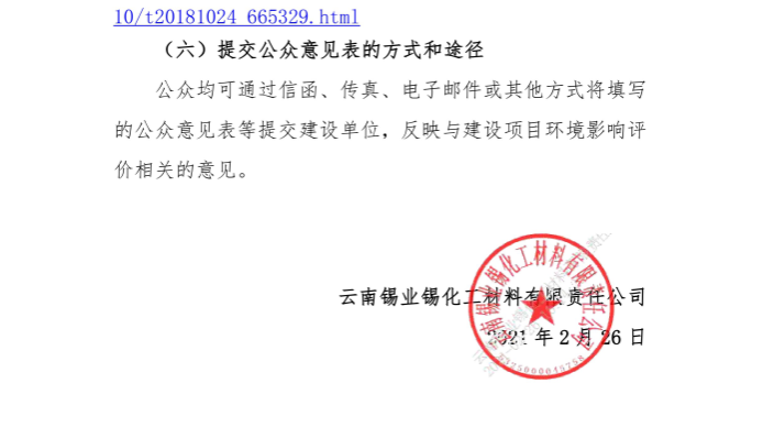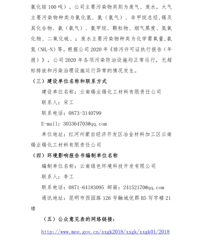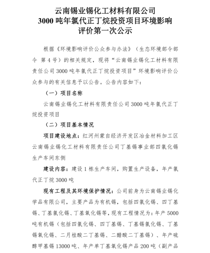 云南錫業錫化工材料有限公司3000噸年氯代正丁烷投資項目環境影響評價第一次公示