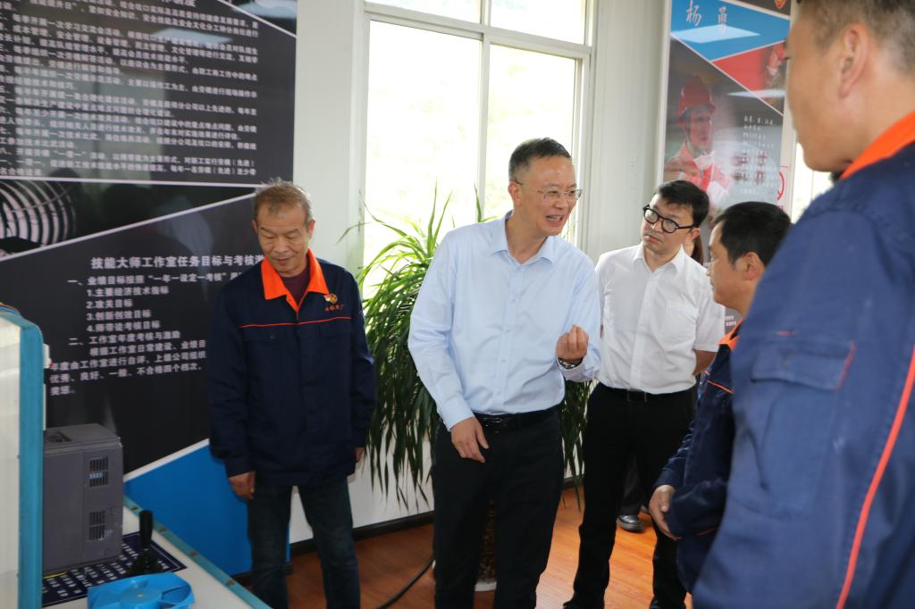 在老廠分公司竹葉山坑楊勇技能大師工作室,胡均與楊勇、張躍源兩位云嶺技能大師進行交流,傾聽他們的成長歷程和工作感悟,希望他們傳承好勞模精神、勞動精神、工匠精神,既帶好徒弟,帶出技師,更要帶出大師;要抓好大師工法的提煉,圖文并茂地做出大師工法課件,結合工作實際做好技能培訓;要進一步提煉勞模、技能大師發揮工匠精神,不斷提煉他們特有的技術特點、工作方法,真正地發現和發揚勞模、大師的閃光點和精神譜系。