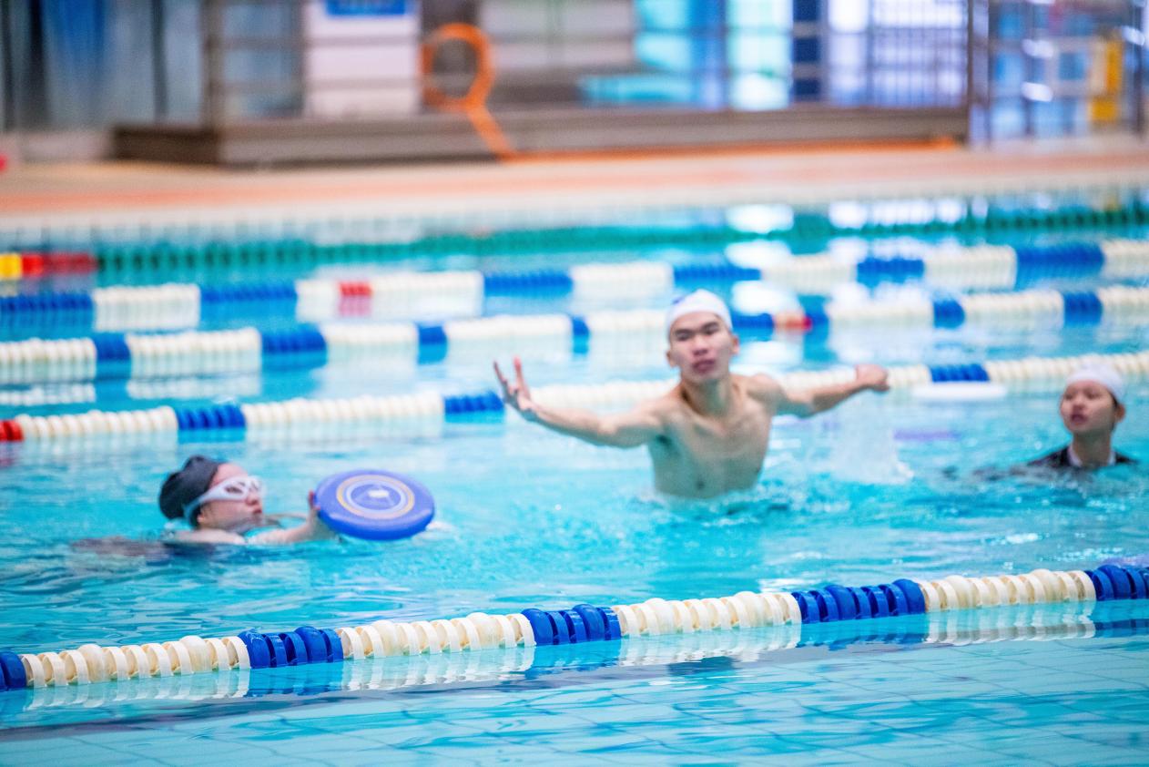 下午舉行的趣味項目更是精彩紛呈。聚集龍珠難度并不比常規項目低,要求兩名女選手把乒乓球運輸到指定位置后在水面撒開,兩名男選手又去救球,把乒乓球聚集在游泳圈內又護送回岸邊。只見各隊八仙過海,各顯神通,紛紛拿出看家本領保護“龍珠”,泳池內頓時水花綻放。水上飛盤項目不僅是力量與速度的競爭,更是考驗個人與團隊的合作。2名隊員在岸邊輪流投擲飛盤,4名隊員在泳池中一字排開,或縱身一躍,或單手接盤,既緊張刺激,又妙趣橫生。