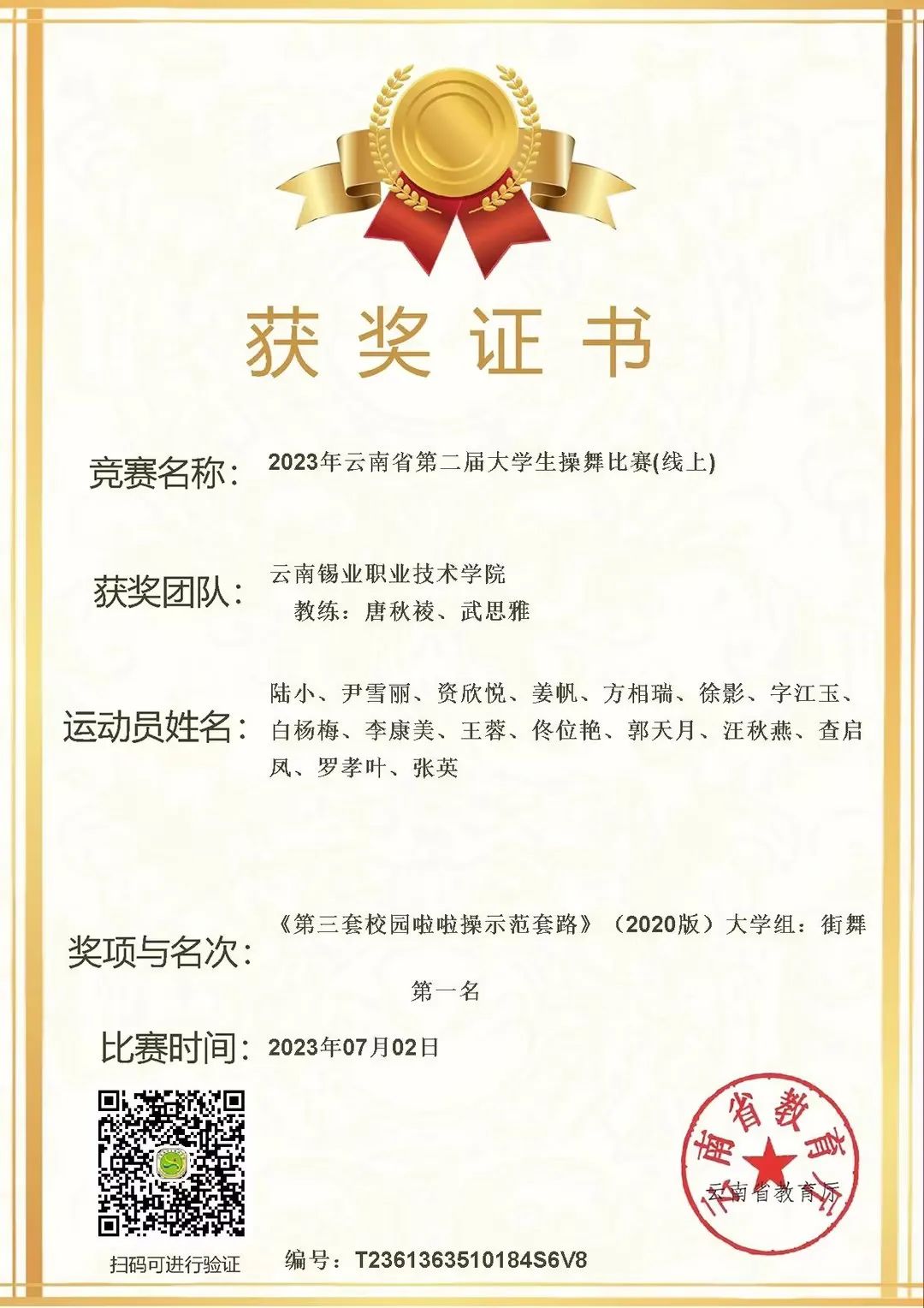 “臺上一分鐘,臺下十年功”,驕人的成績背后凝聚了師生辛勤的汗水。她們早晚練、周末練,是夢想、是團(tuán)隊的力量支撐著不斷努力和堅持下去。經(jīng)過激烈角逐,《第三套校園啦啦操示范套路》大學(xué)組街舞獲得了第一名,《2019年版健美操大眾鍛煉標(biāo)準(zhǔn)》一級、《第三套校園啦啦操示范套路》大學(xué)組花球、《2018年普及版民族健身操》、自編校園啦啦操四個項(xiàng)目獲得第二名,2018年廣場舞推廣套路《點(diǎn)贊新時代》獲得第四名,自編廣場舞、《2020版全國大學(xué)生街舞推廣套路》Hiphop兩個項(xiàng)目獲得第六名。