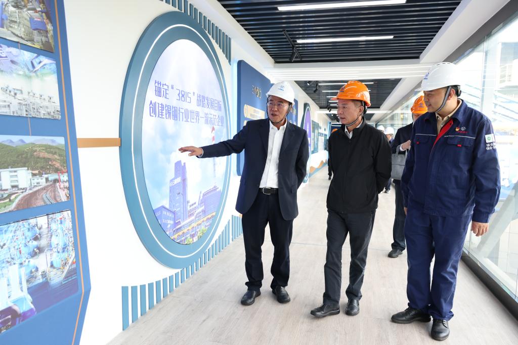 會(huì)前,黃長(zhǎng)庚參觀了錫冶煉智慧運(yùn)營(yíng)中心、熔煉車間頂吹爐主控室、精煉車間直線澆鑄系統(tǒng)、5G智能倉(cāng)儲(chǔ)和錫文化長(zhǎng)廊,詳細(xì)了解云錫全產(chǎn)業(yè)鏈中的冶煉環(huán)節(jié)和云錫在采選冶深等領(lǐng)域取得的數(shù)字化、智能化建設(shè)成果。