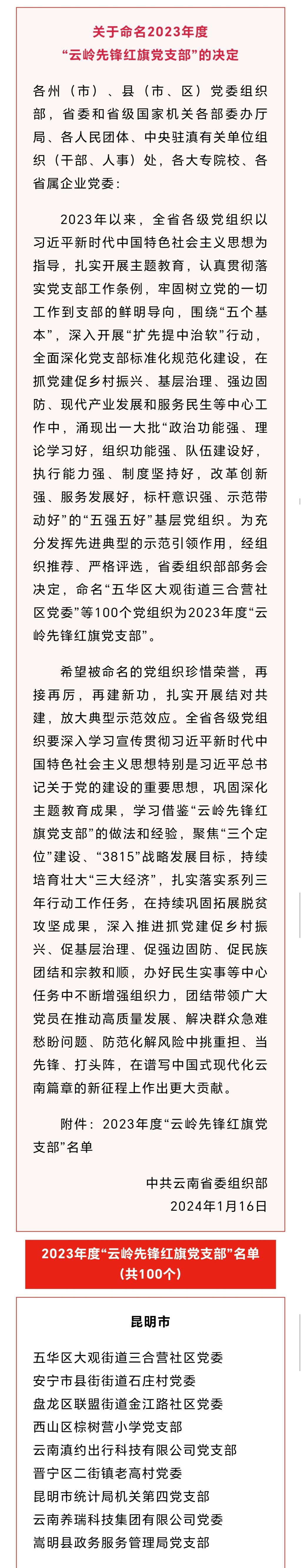 近日,中共云南省委組織部發布了《關于命名2023年度“云嶺先鋒紅旗黨支部”的決定》,華聯鋅銦公司新田選礦車間黨支部榜上有名。