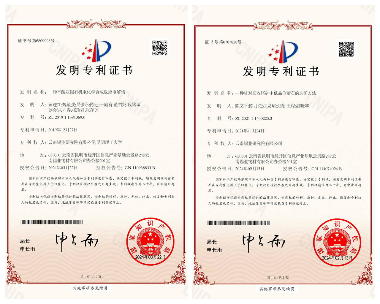 研究院公司圍繞云錫主業(yè)、砷產(chǎn)業(yè)等,持續(xù)加大科技研發(fā)投入,加快技術(shù)研發(fā),積極營造良好的科技創(chuàng)新環(huán)境和氛圍。廣大科技人員充分發(fā)揮專業(yè)所長,深度挖掘,在新工藝、新技術(shù)、新產(chǎn)品等方面奮力攻關(guān)、全力突破,取得新的進展和成效。《一種針對回收尾礦中低品位螢石的選礦方法》《一種辛酸亞錫有機電化學(xué)合成反應(yīng)電解槽》2件發(fā)明專利以及《一種高效選礦粗砂搖床面》等6件實用新型專利獲國家知識產(chǎn)權(quán)局授權(quán),進一步豐富核心技術(shù)儲備,著力打造云錫科技創(chuàng)新平臺,推動云錫科技創(chuàng)新。