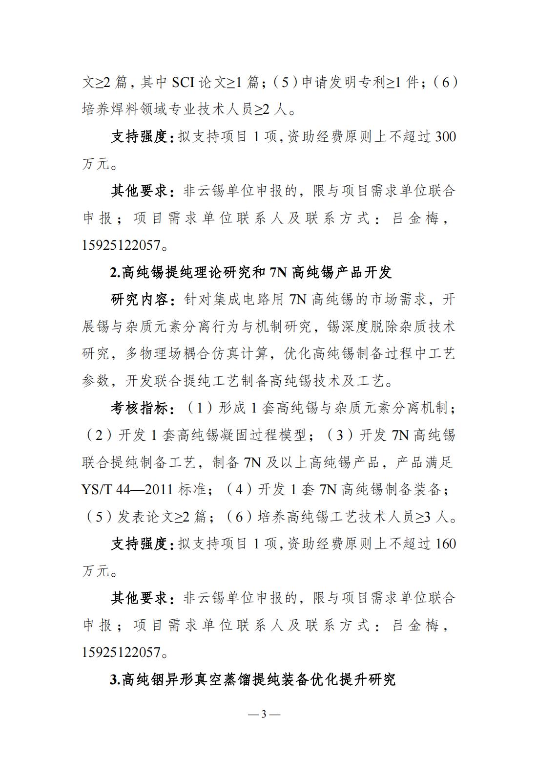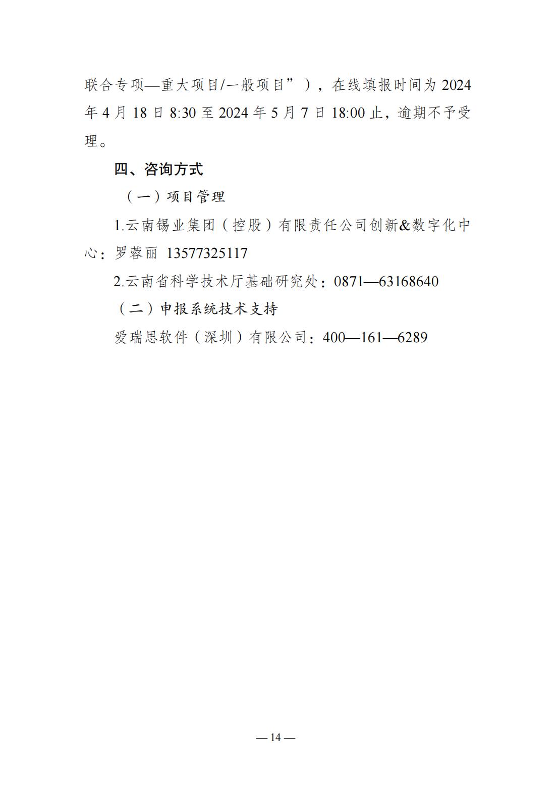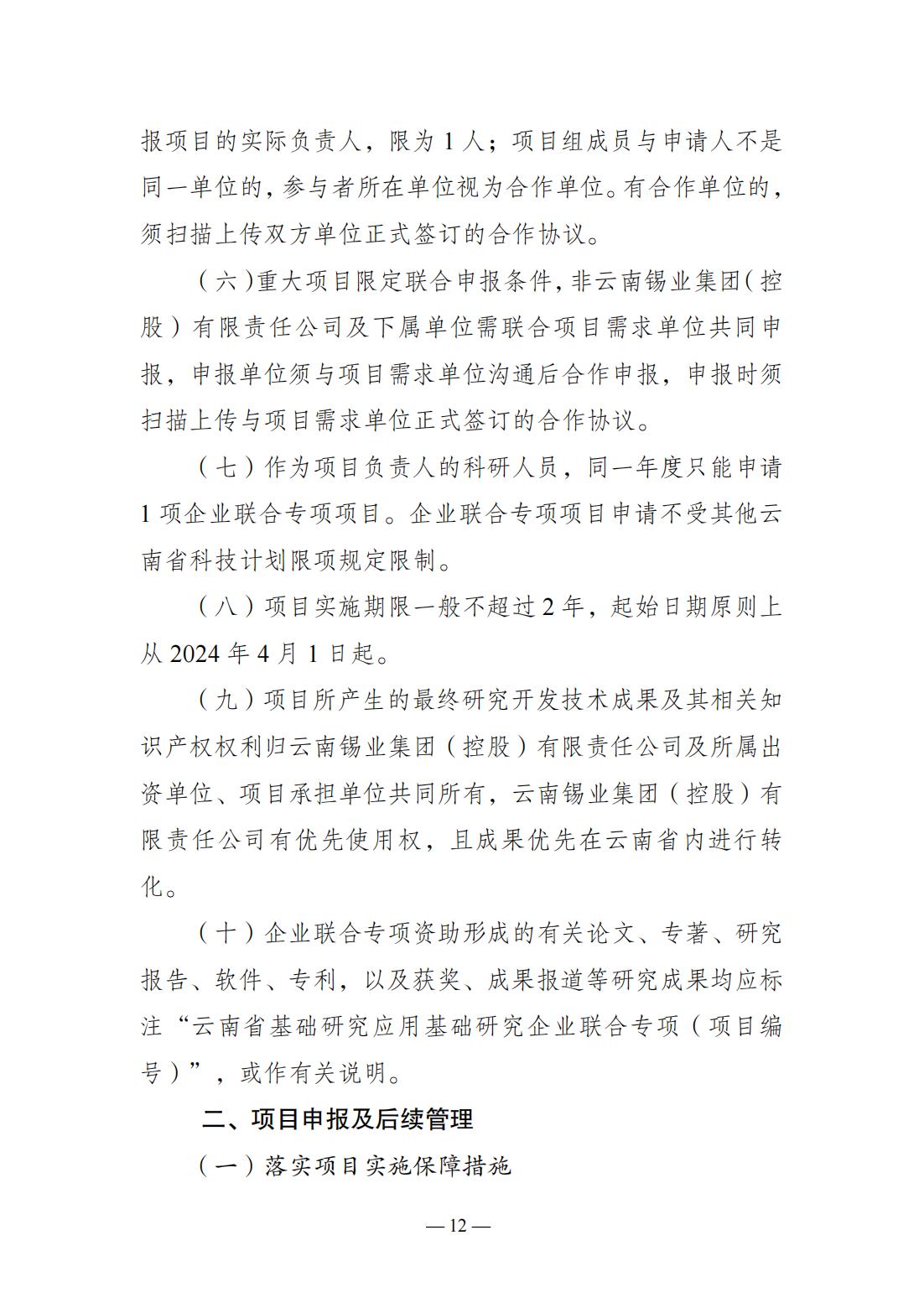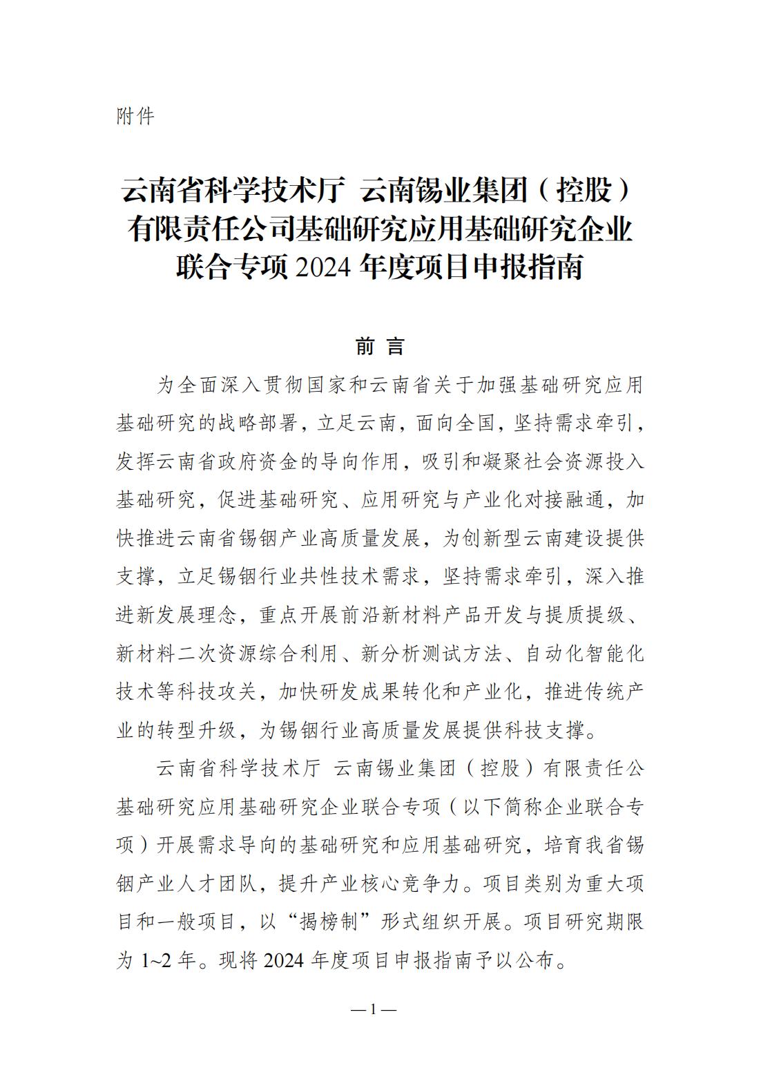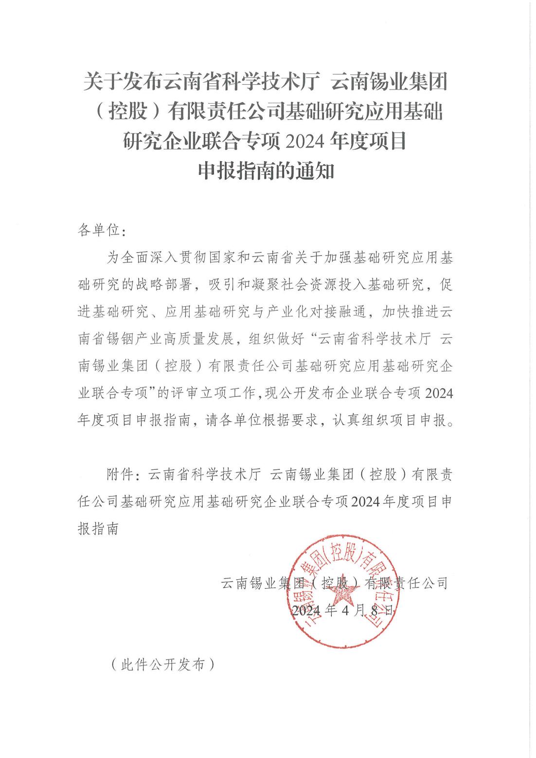 關(guān)于發(fā)布云南省科學(xué)技術(shù)廳 云南錫業(yè)集團(tuán)(控股)有限責(zé)任公司基礎(chǔ)研究應(yīng)用基礎(chǔ)研究企業(yè)聯(lián)合專項2024年度項目申報指南的通知