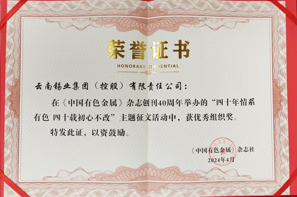 此次榮譽的獲得,是對云錫各項工作的肯定,也是對云錫未來發展的希冀。云錫將繼續通過《中國有色金屬》雜志的平臺講好云錫故事,傳播云錫聲音,進一步在有色行業內樹立良好企業形象,提升知名度和影響力。