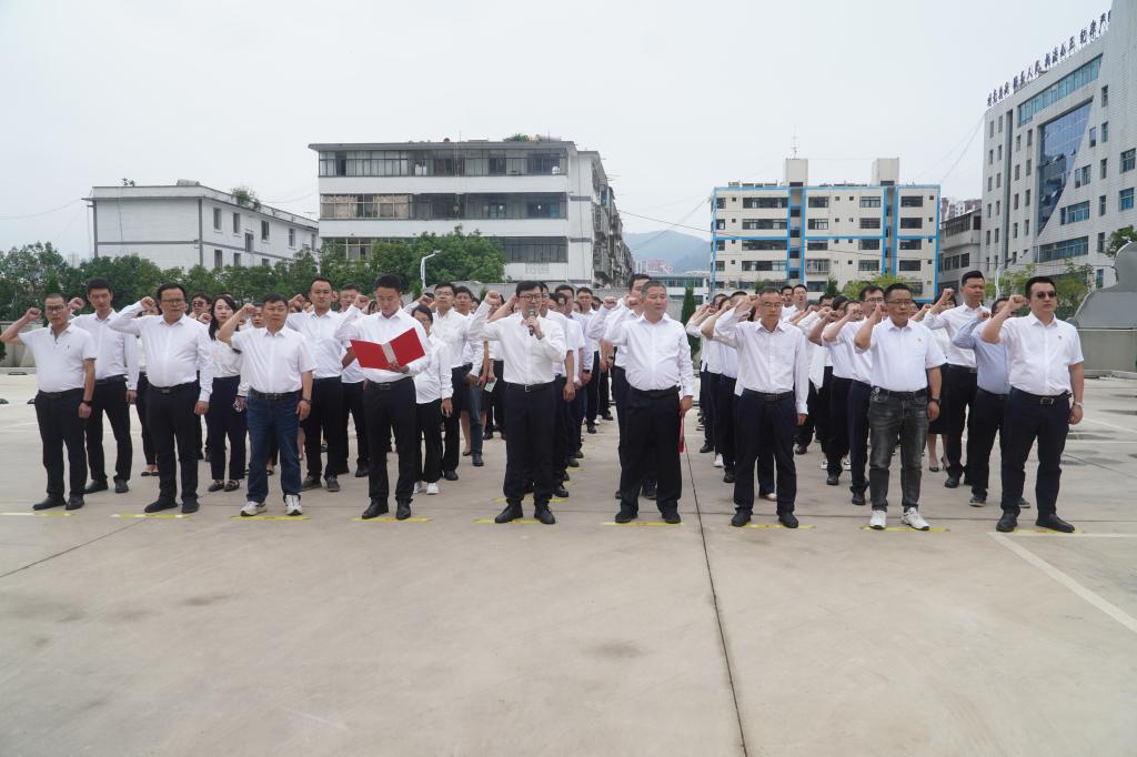 物流公司、錫都實業公司在云錫個舊辦公樓聯合舉行安全月活動升旗儀式,唱安全歌、升安全旗,宣讀《安全環保倡議書》,進行安全宣誓,并在主題橫幅上鄭重簽名承諾。(肖涵月)