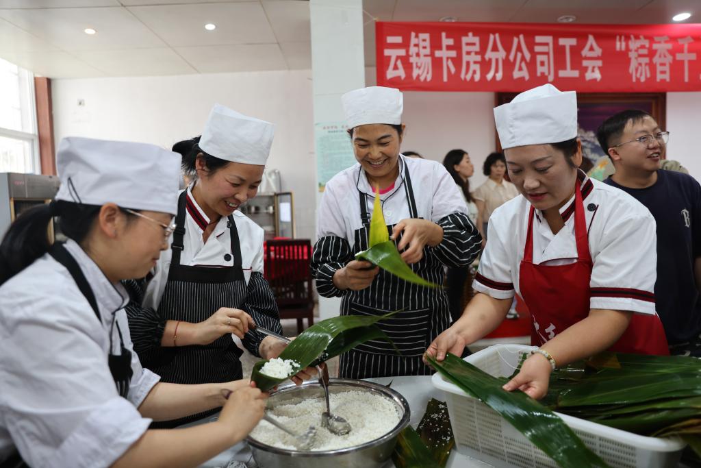 卡房分公司開展“粽香千里 情系卡房”端午節比賽活動。隨著計時口令的發出,大家雙手靈巧地舞動著,將糯米、粽葉巧妙地組合成一個個精致的粽子,在一場充滿激情的無聲較量中增進交流互動。(毛軒)