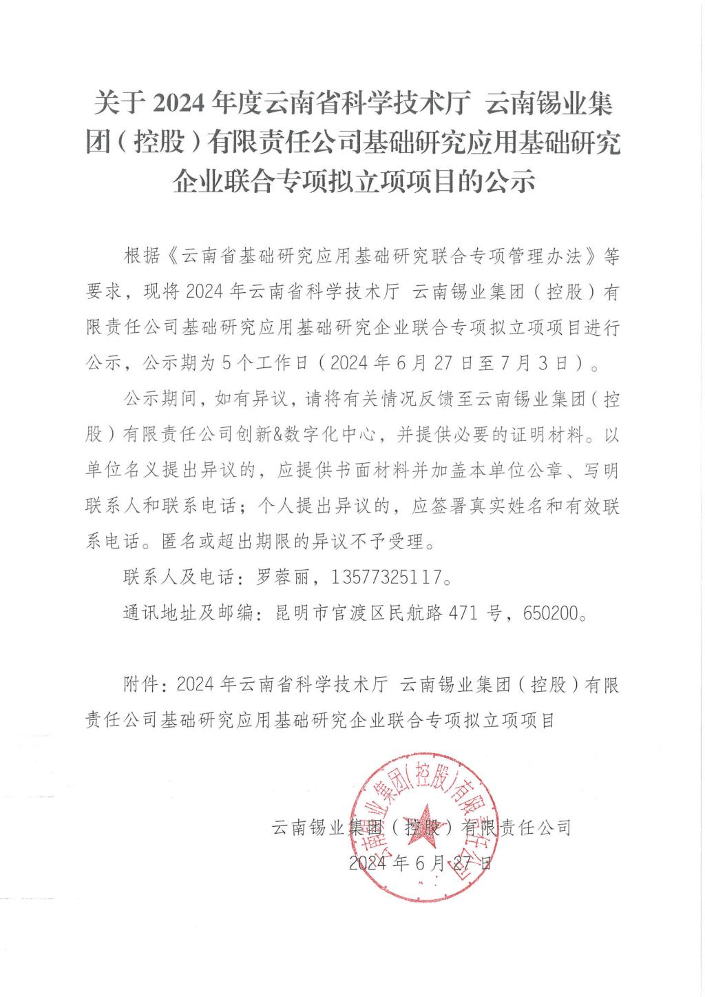 關于2024年度云南省科學技術廳 云南錫業集團(控股)有限責任公司基礎研究應用基礎研究企業聯合專項擬立項項目的公示