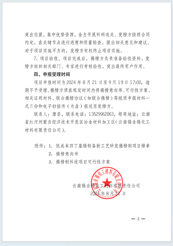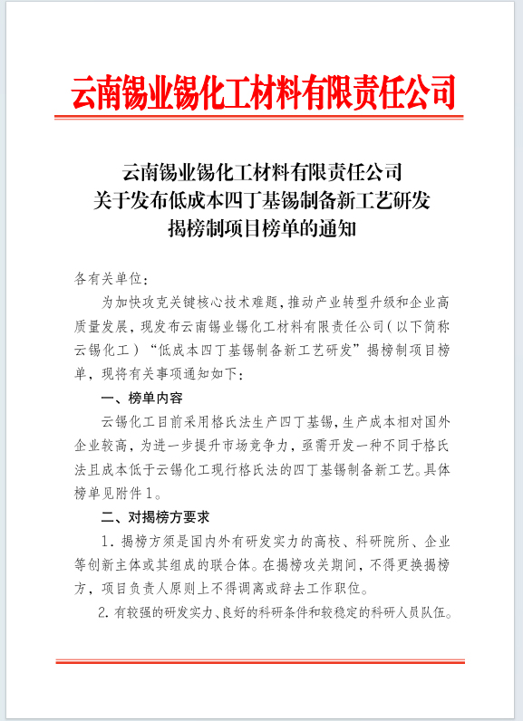 錫化工關于發布低成本四丁基錫制備新工藝研發揭榜制項目榜單的通知