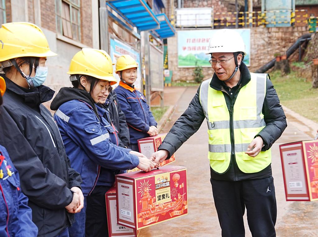 乙巳除夕,瑞雪兆豐年,慰問暖人心。1月28日,控股公司黨委書記、董事長孫勇率隊到老廠分公司、卡房分公司、大屯錫礦、錫業分公司、銅業分公司、錫化工公司看望慰問春節期間堅守崗位干部職工,并查看了解現場安全生產情況。控股公司總經理助理李師勇、安全副總監吳紅星參加慰問。