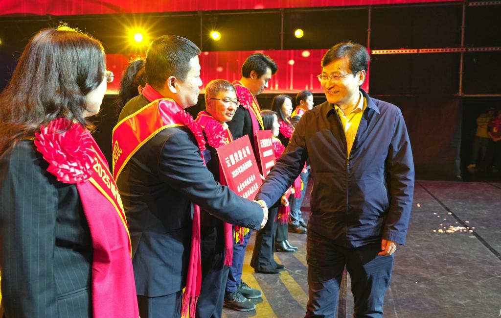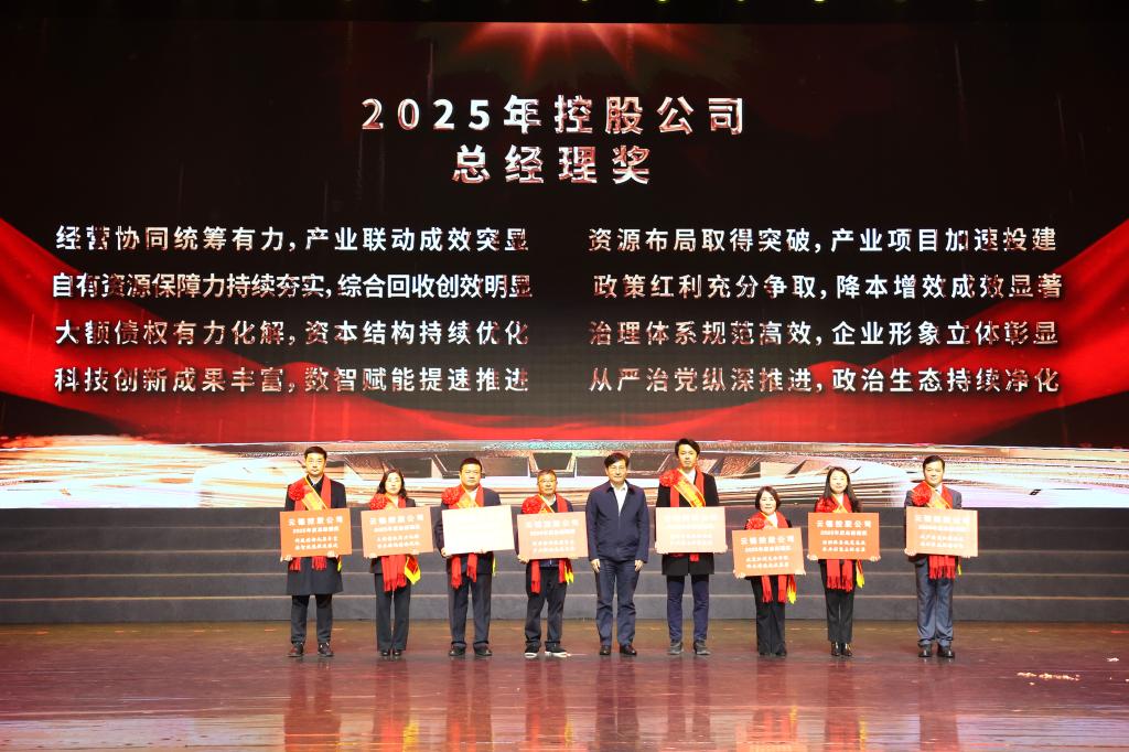 控股公司黨委副書記、副董事長、總經理韓守禮為2025年控股公司總經理獎獲獎團隊代表頒獎并合影。