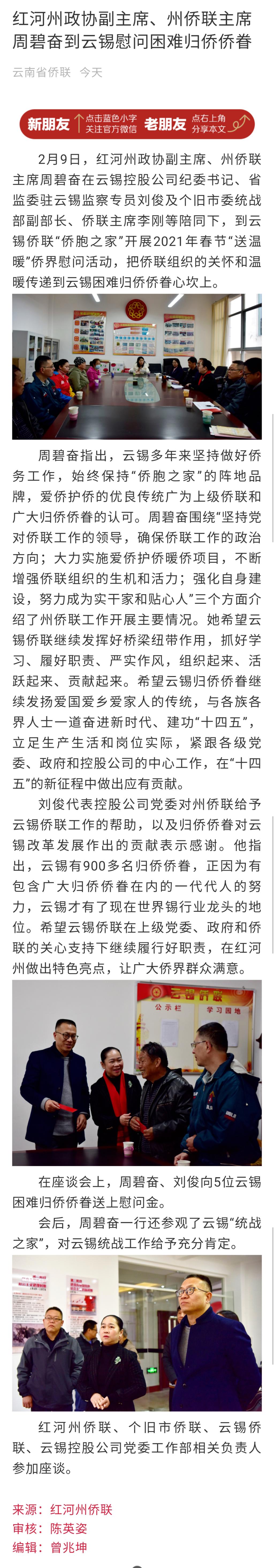 云南省僑聯:紅河州政協副主席、州僑聯主席周碧奮到云錫慰問困難歸僑僑眷