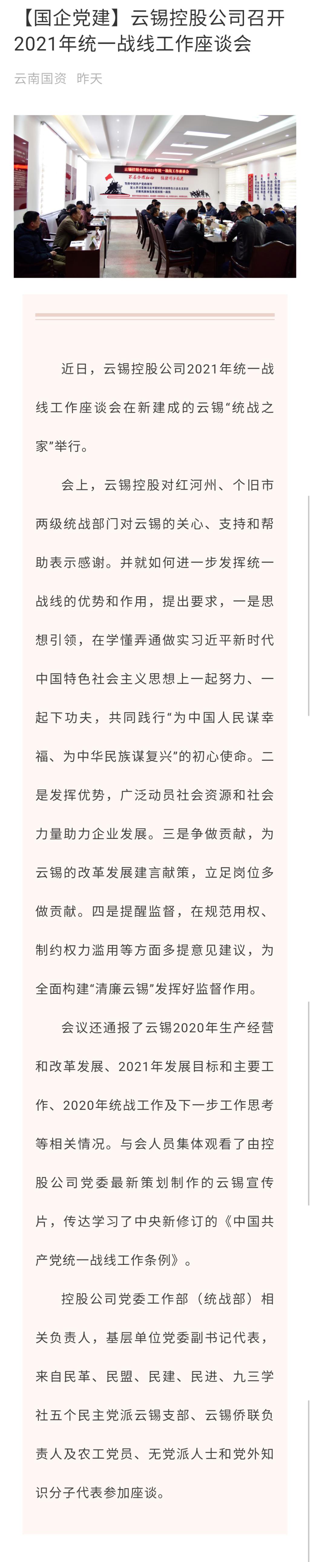 云南國資、搜狐網(wǎng):【國企黨建】云錫控股公司召開2021年統(tǒng)一戰(zhàn)線工作座談會