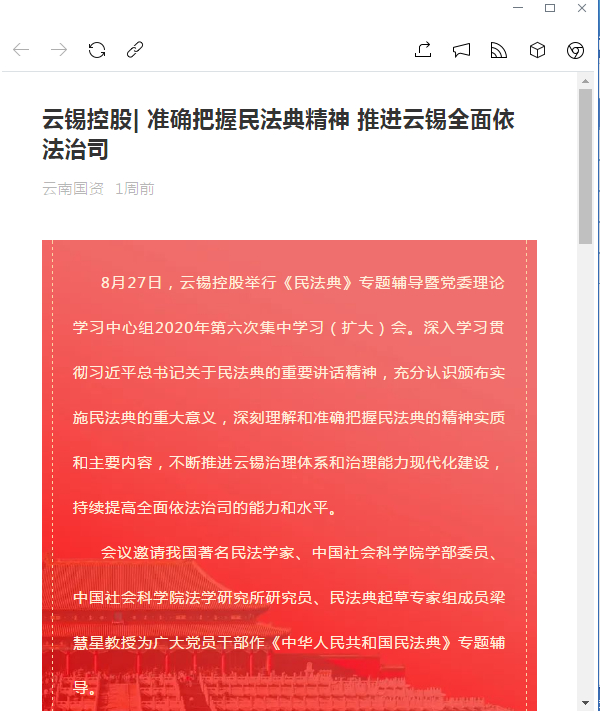8月27日,云錫控股舉行《民法典》專題輔導(dǎo)暨黨委理論學(xué)習(xí)中心組2020年第六次集中學(xué)習(xí)(擴(kuò)大)會(huì)。深入學(xué)習(xí)貫徹習(xí)近平總書記關(guān)于民法典的重要講話精神,充分認(rèn)識(shí)頒布實(shí)施民法典的重大意義,深刻理解和準(zhǔn)確把握民法典的精神實(shí)質(zhì)和主要內(nèi)容,不斷推進(jìn)云錫治理體系和治理能力現(xiàn)代化建設(shè),持續(xù)提高全面依法治司的能力和水平。
