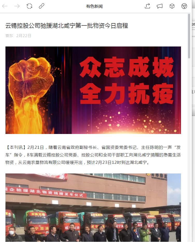 【本刊訊】2月21日,隨著云南省政府副秘書長、省國資委黨委書記、主任陳明的一聲“發車”指令,8車滿載云錫控股公司黨委、控股公司和全司干部職工向湖北咸寧捐贈的急需生活物資,從云南農墾物流有限公司緩緩開出,預計2月23日12時到達湖北咸寧。