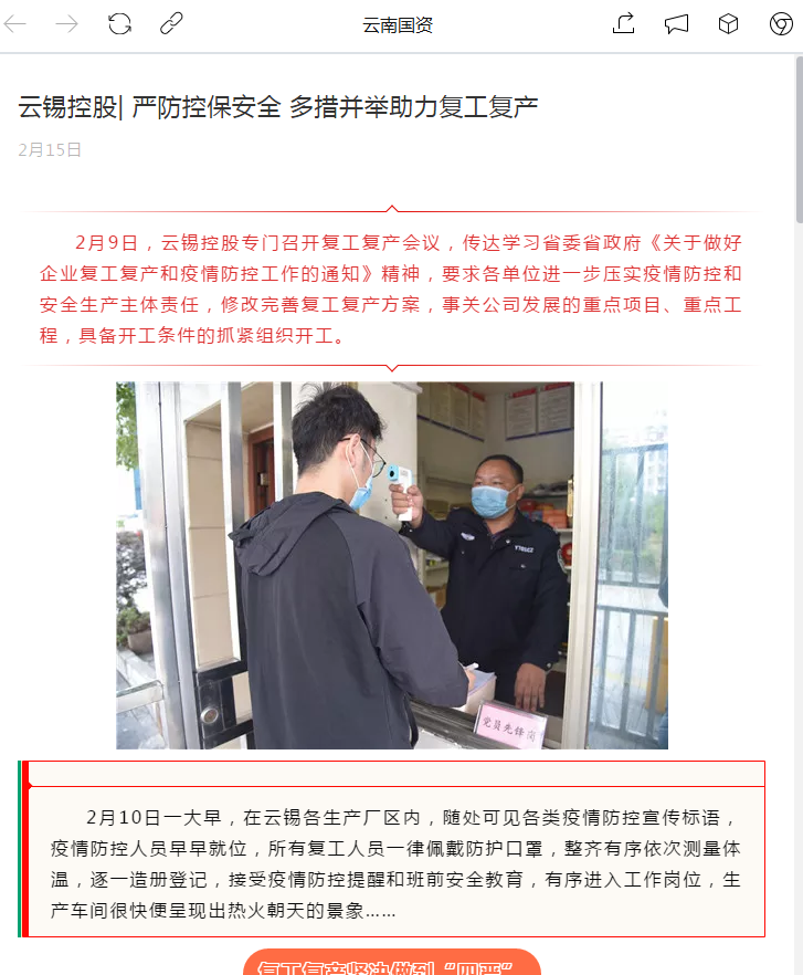 2月9日,云錫控股公司專門召開復(fù)工復(fù)產(chǎn)會(huì)議,傳達(dá)學(xué)習(xí)省委省政府《關(guān)于做好企業(yè)復(fù)工復(fù)產(chǎn)和疫情防控工作的通知》精神,要求各單位進(jìn)一步壓實(shí)疫情防控和安全生產(chǎn)主體責(zé)任,修改完善復(fù)工復(fù)產(chǎn)方案,事關(guān)公司發(fā)展的重點(diǎn)項(xiàng)目、重點(diǎn)工程,具備開工條件的抓緊組織開工。
