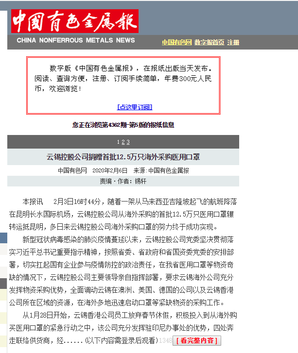 新型冠狀病毒感染肺炎疫情蔓延以來,云錫控股公司黨委堅決貫徹落實習近平總書記重要指示精神,按照省委、省政府和省國資委黨委的安排部署,切實扛起國有企業參與疫情防控的政治責任,在我省醫用口罩等物資奇缺的情況下,云錫控股公司主要領導親自指揮部署,要求云錫海外公司充分發揮物資采購優勢,全面調動云錫在澳洲、美國、德國的公司以及云錫香港公司所在區域的資源,在海外多地迅速啟動口罩等緊缺物資的采購工作。
