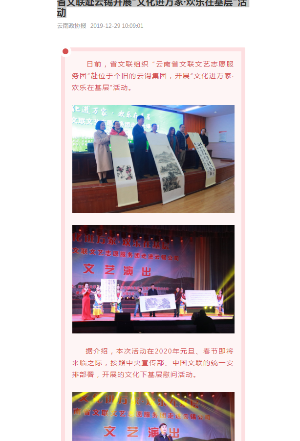 日前,省文聯(lián)組織 “云南省文聯(lián)文藝志愿服務(wù)團”赴位于個舊的云錫集團,開展“文化進萬家·歡樂在基層”活動。