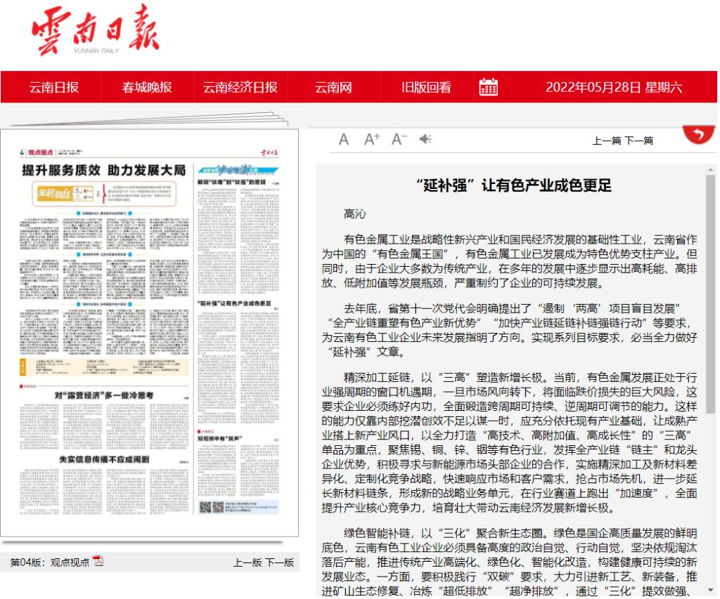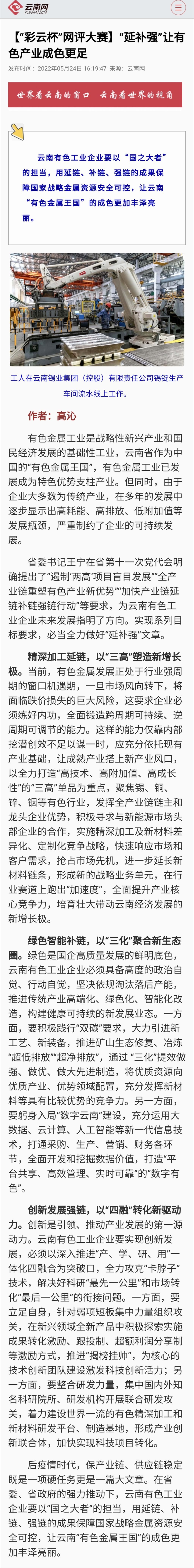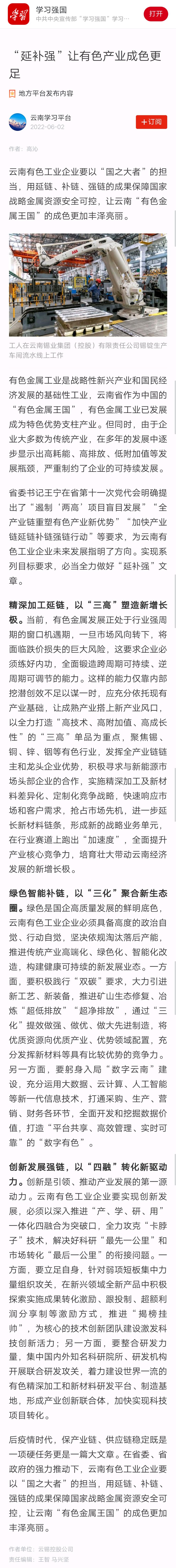 學習強國、云南日報、云南網、中國有色金屬報:“延補強”讓有色產業成色更足