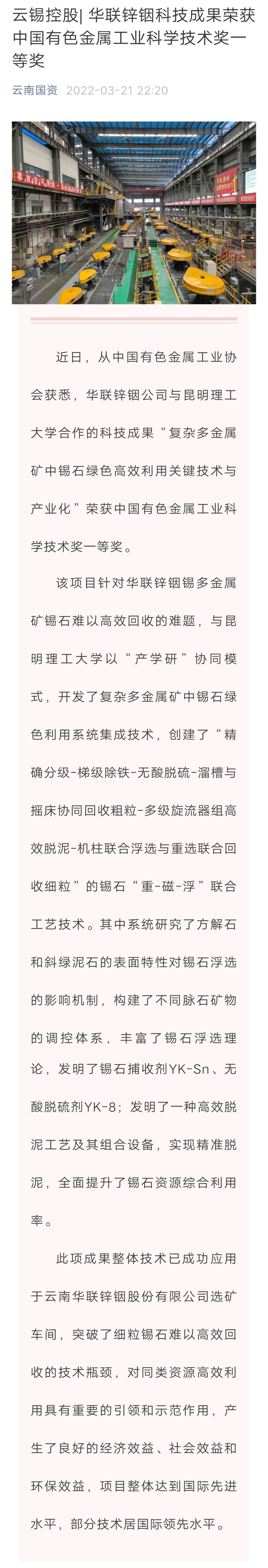 云南國資:華聯(lián)鋅銦科技成果榮獲中國有色金屬工業(yè)科學技術(shù)獎一等獎