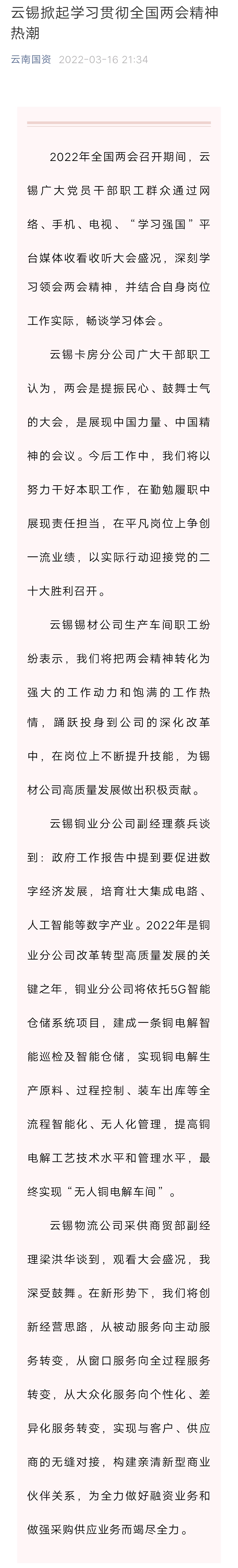 云南國資:云錫掀起學習貫徹全國兩會精神熱潮