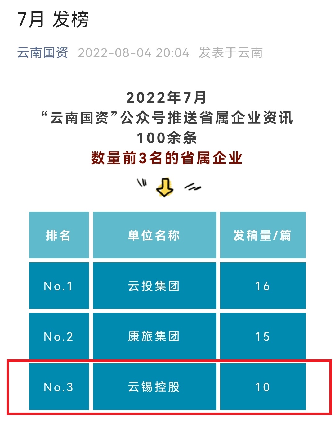 7月,控股公司創新宣傳工作方式方法,緊緊圍繞生產經營、改革發展、黨建品牌等重點工作講好云錫故事,向政府、金融機構等傳遞了云錫好聲音,好經驗,新聞輿論傳播力、引導力、影響力、公信力進一步提升,在云南國資發布的發稿量榜單中進入前三。