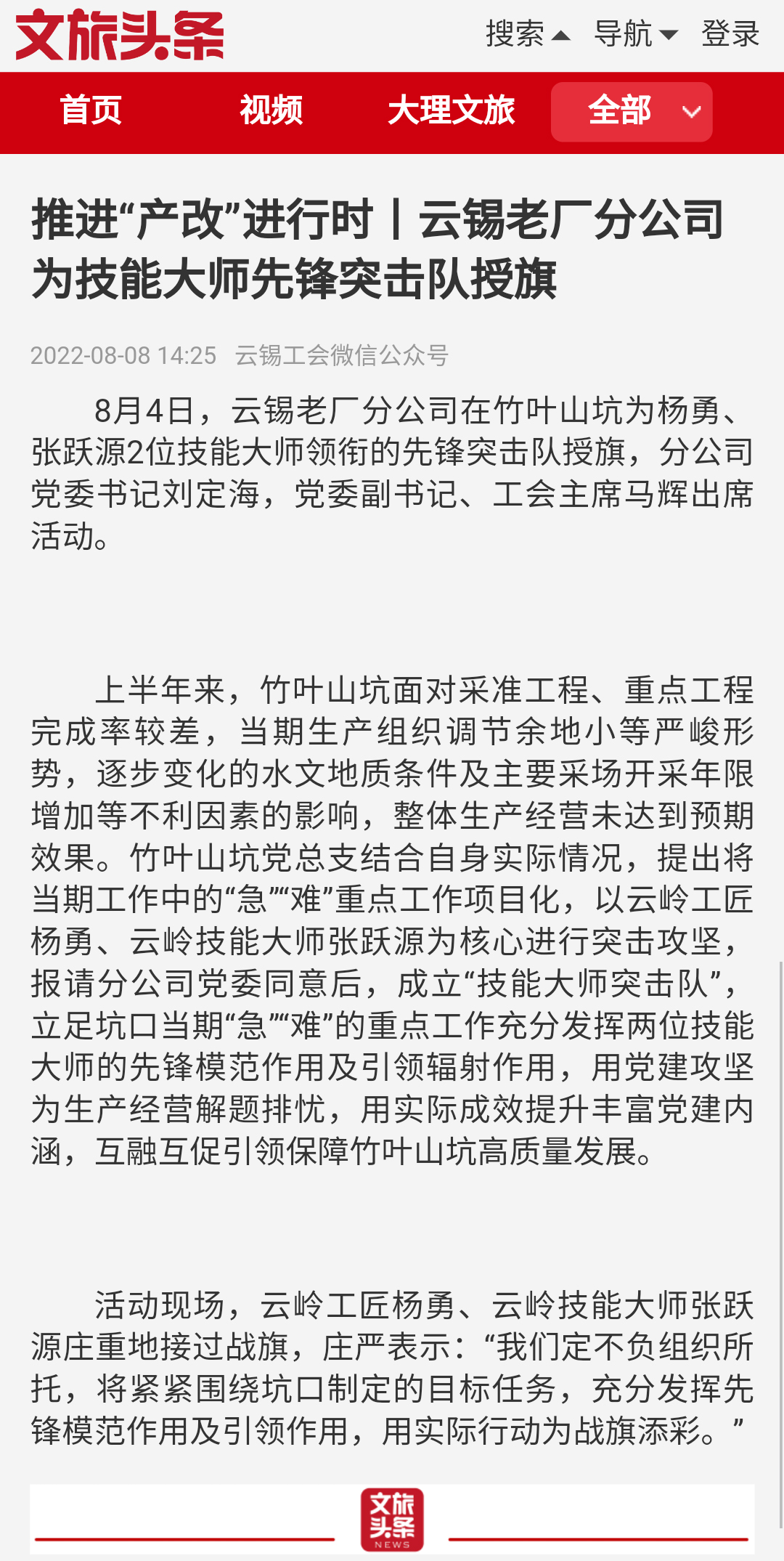 文旅頭條:云錫老廠分公司為技能大師先鋒突擊隊授旗