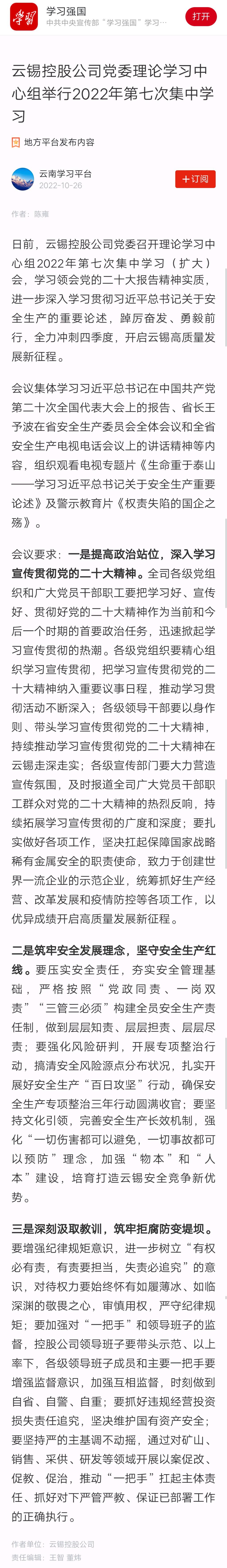 學習強國:云錫控股公司黨委理論學習中心組舉行2022年第七次集中學習
