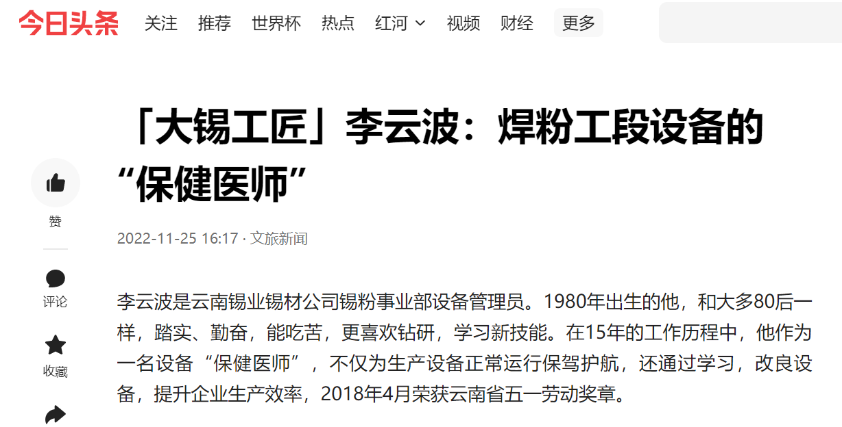 今日頭條、網易、一點資訊、百度、文旅頭條:【大錫工匠】李云波:焊粉工段設備的“保健醫師”