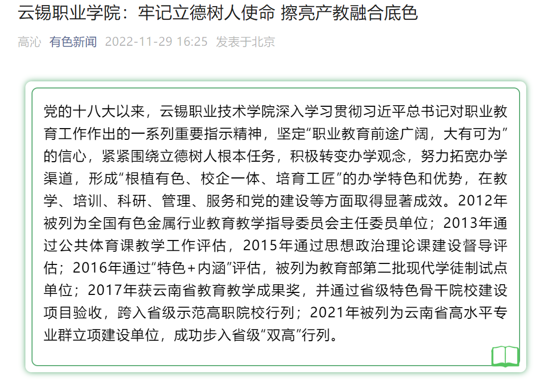 中國有色金屬報、有色新聞:云錫職業學院牢記立德樹人使命 擦亮產教融合底色