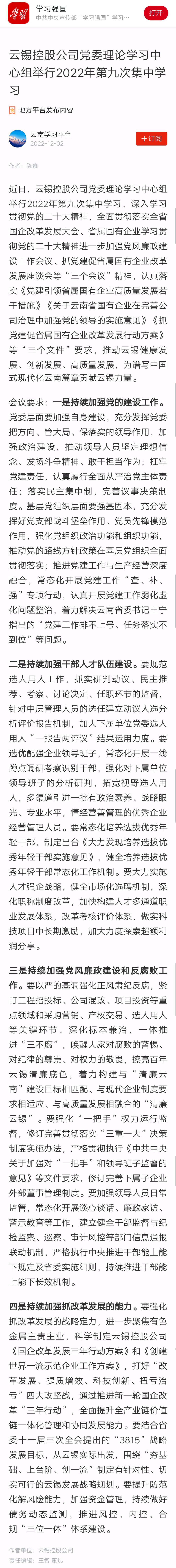 學習強國:云錫控股公司黨委理論學習中心組舉行2022年第九次集中學習