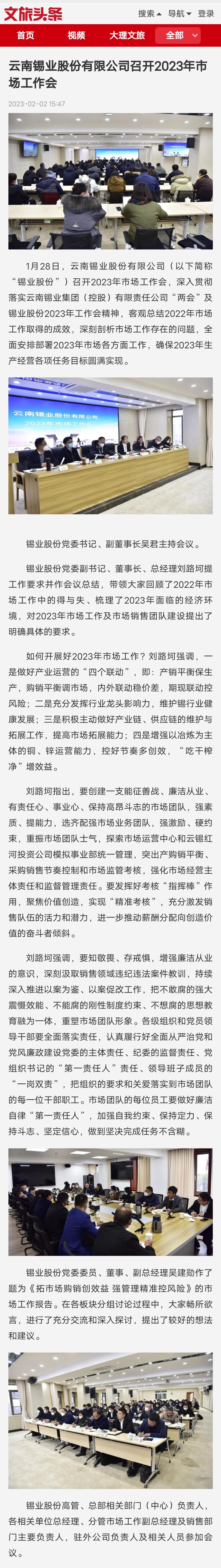 文旅頭條:云南錫業(yè)股份有限公司召開(kāi)2023年市場(chǎng)工作會(huì)