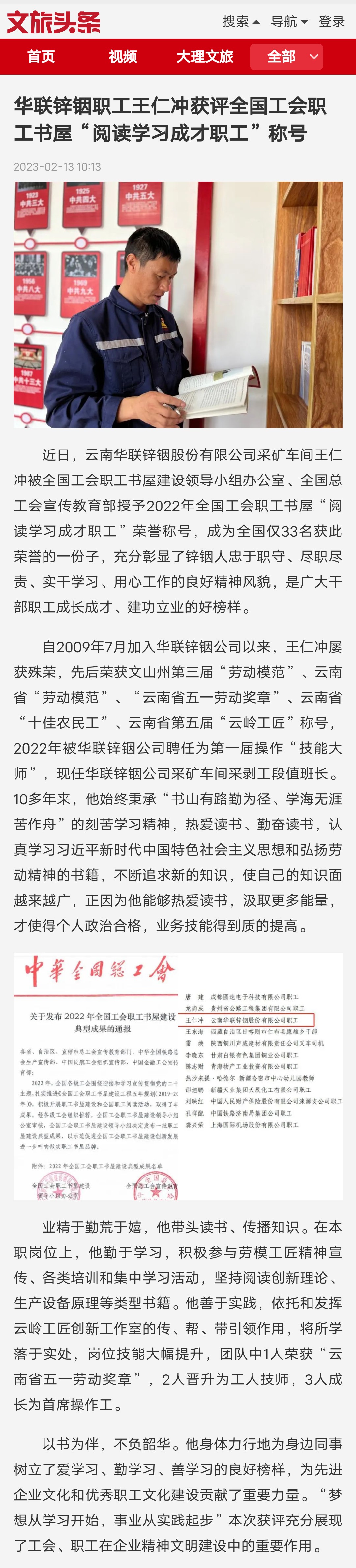 文旅頭條:華聯鋅銦職工王仁沖獲評全國工會職工書屋“閱讀學習成才職工”稱號