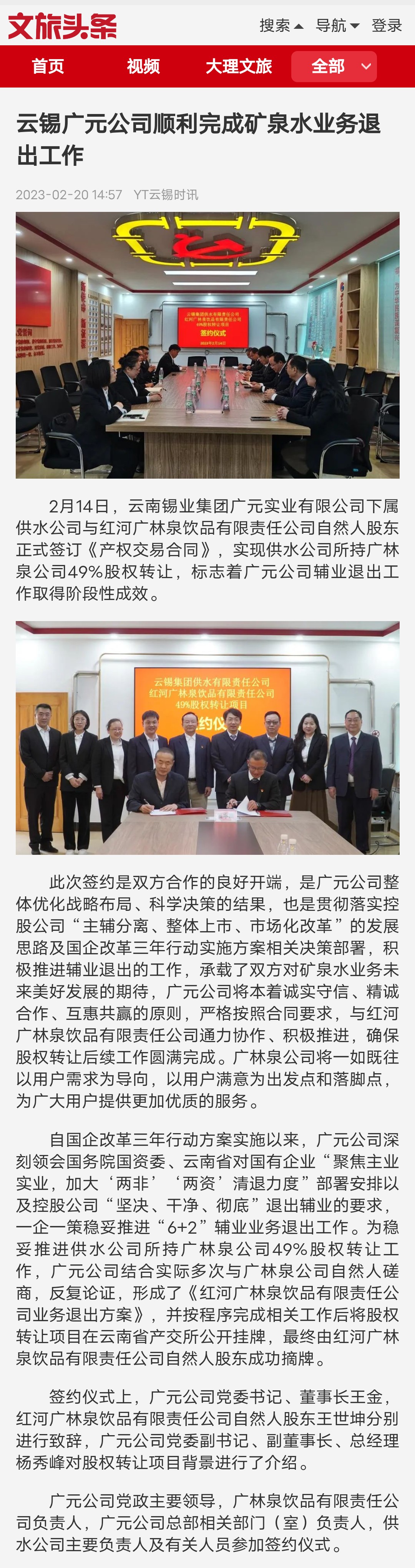 文旅頭條:云錫廣元公司順利完成礦泉水業務退出工作