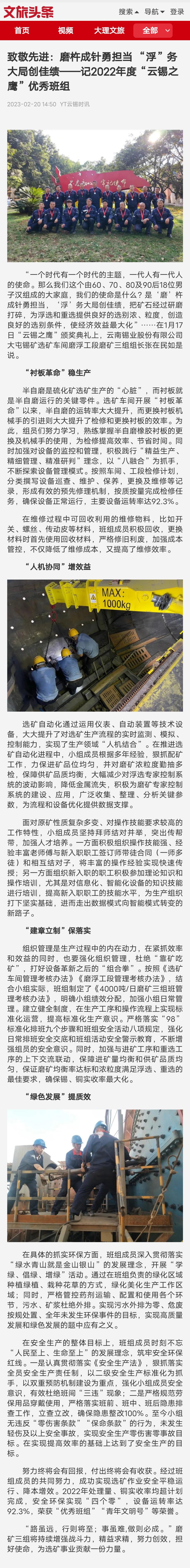 文旅頭條:致敬先進:磨杵成針勇擔當 “浮”務大局創佳績——記2022年度“云錫之鷹”優秀班組