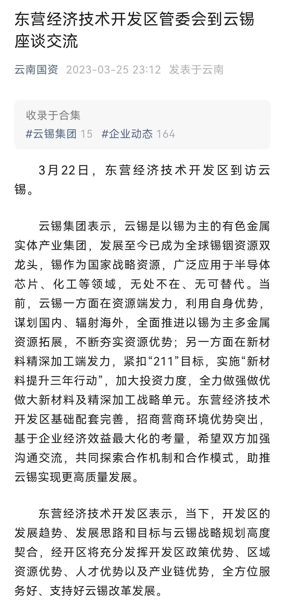 云南國資:東營經濟技術開發區管委會到云錫座談交流