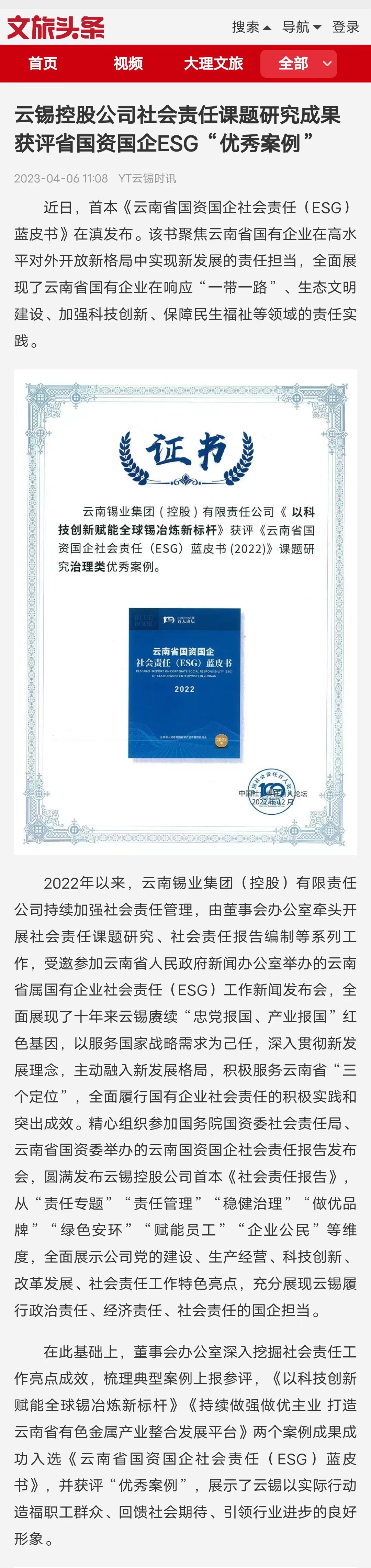 文旅頭條:云錫控股公司社會責任課題研究成果獲評省國資國企ESG“優秀案例”
