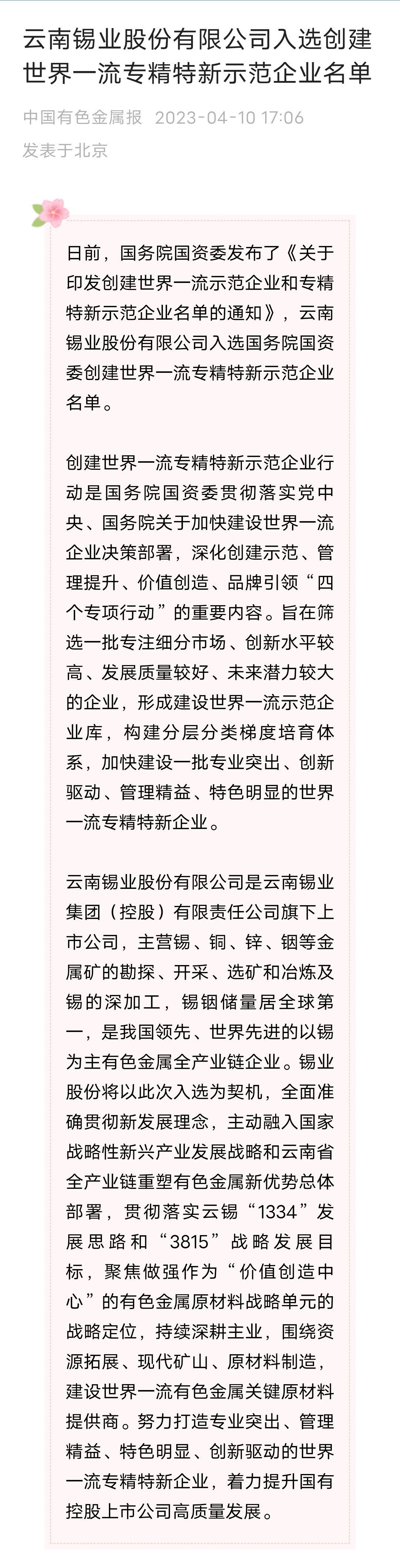 中國有色金屬報:云南錫業股份有限公司入選創建世界一流專精特新示范企業名單