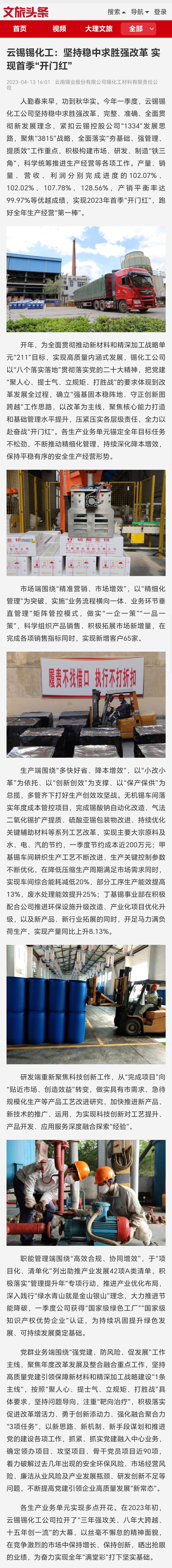 文旅頭條:云錫錫化工:堅持穩(wěn)中求勝強改革 實現(xiàn)首季“開門紅”