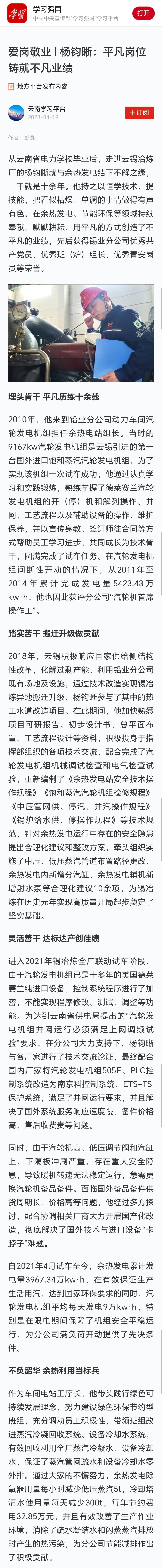 學習強國:愛崗敬業 | 楊鈞晰:平凡崗位鑄就不凡業績