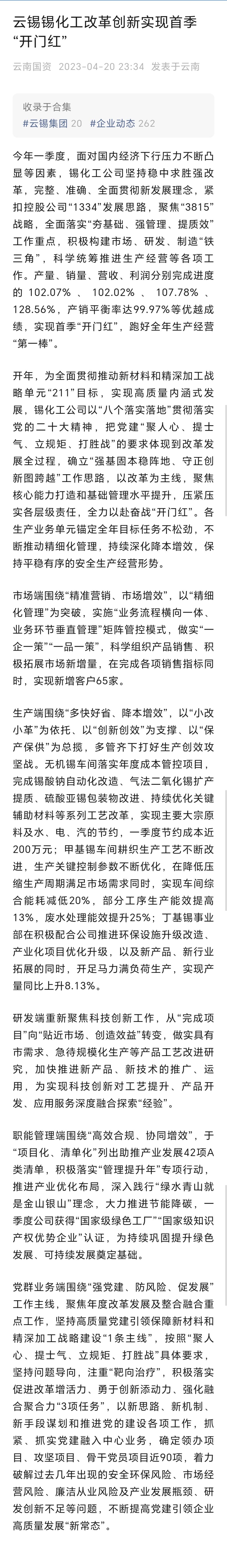 云南國資:云錫錫化工改革創新實現首季“開門紅”