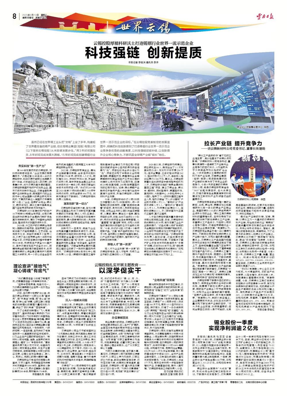 今年以來,云南錫業(yè)股份有限公司聚焦云南“3815”戰(zhàn)略發(fā)展目標(biāo),以入選國務(wù)院國資委創(chuàng)建世界一流專業(yè)領(lǐng)軍示范企業(yè)名單為契機,聚焦做強作為“價值創(chuàng)造中心”的有色金屬原材料戰(zhàn)略單元的戰(zhàn)略定位,在高質(zhì)量發(fā)展大道上換擋提速。一季度,錫業(yè)股份生產(chǎn)有色金屬8.04萬噸,實現(xiàn)營業(yè)收入111.21億元,實現(xiàn)歸母凈利潤2.67億元。