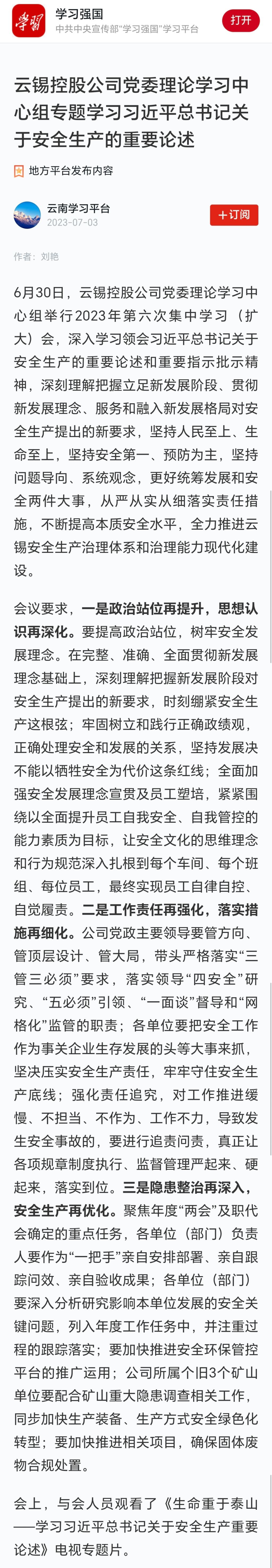 學習強國:云錫控股公司黨委理論學習中心組專題學習習近平總書記關于安全生產的重要論述
