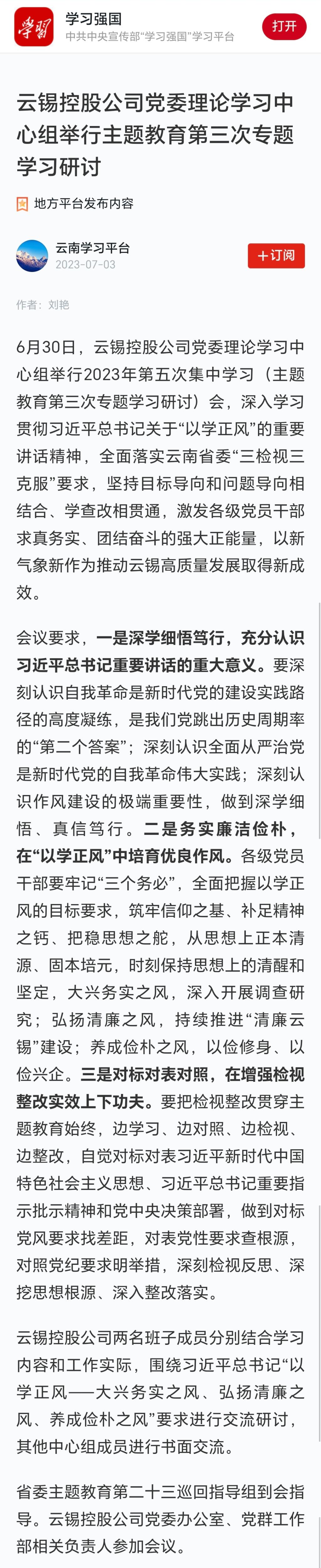 學習強國:云錫控股公司黨委理論學習中心組舉行主題教育第三次專題學習研討
