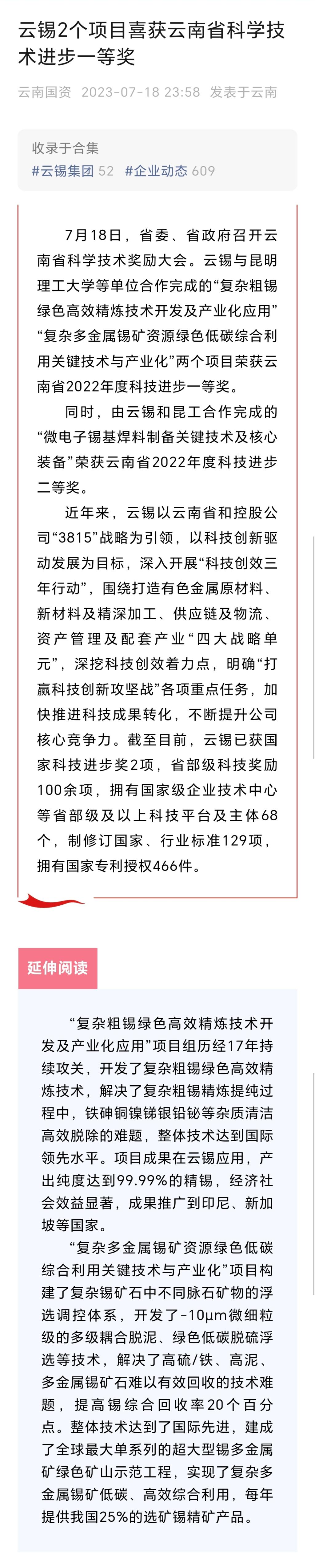 云南國資:云錫2個項目喜獲云南省科學技術進步一等獎