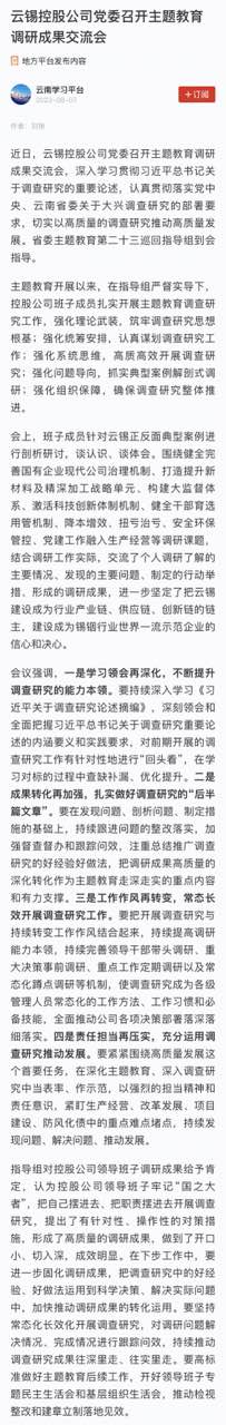學習強國:云錫控股公司黨委召開主題教育調研成果交流會