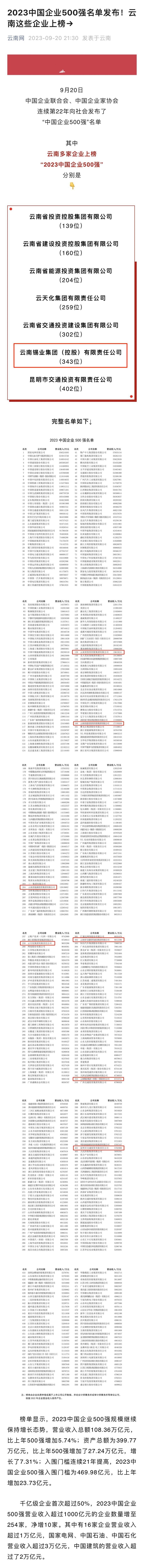 云南網:2023中國企業500強名單發布!云南這些企業上榜→