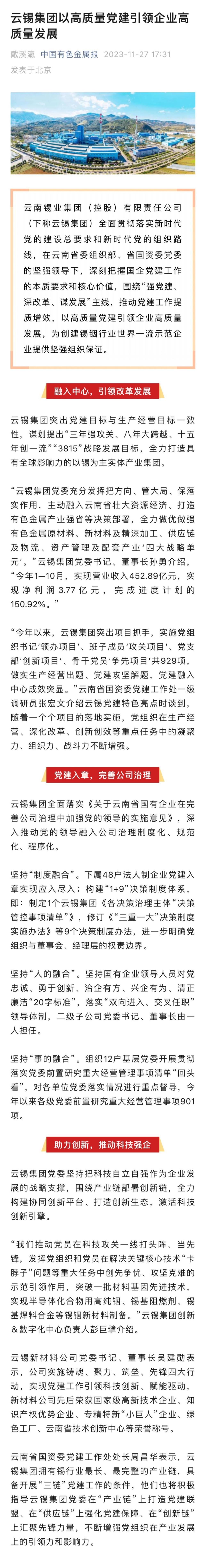 中國有色金屬報:云錫集團以高質量黨建引領企業高質量發展