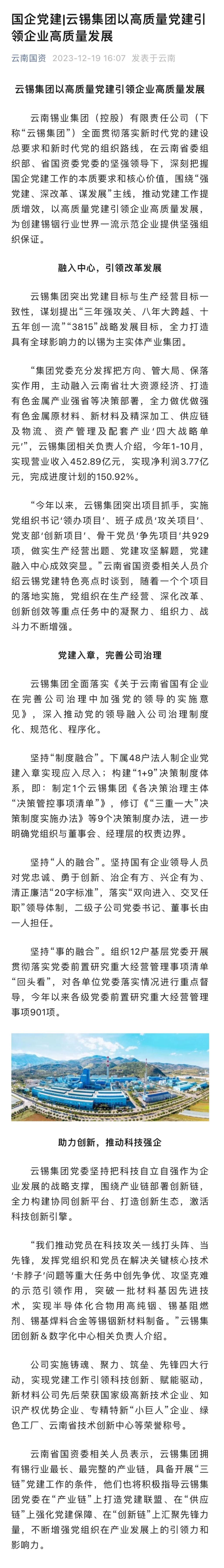 云南國資:云錫集團以高質量黨建引領企業高質量發展