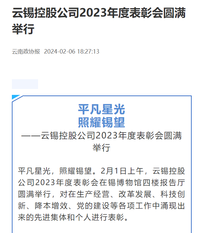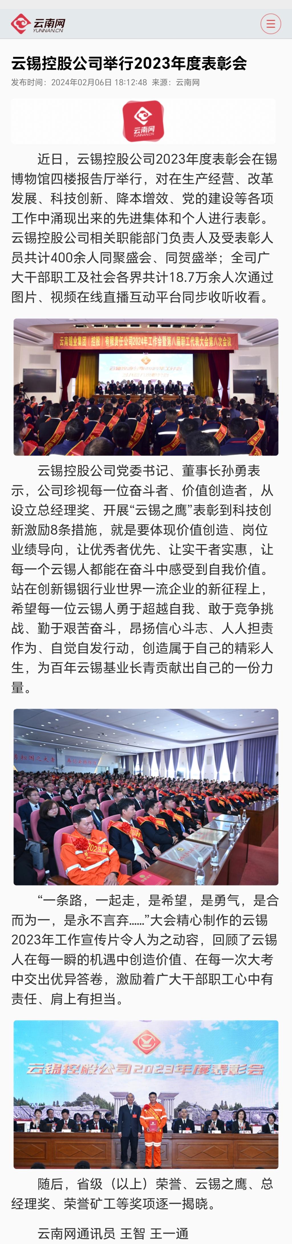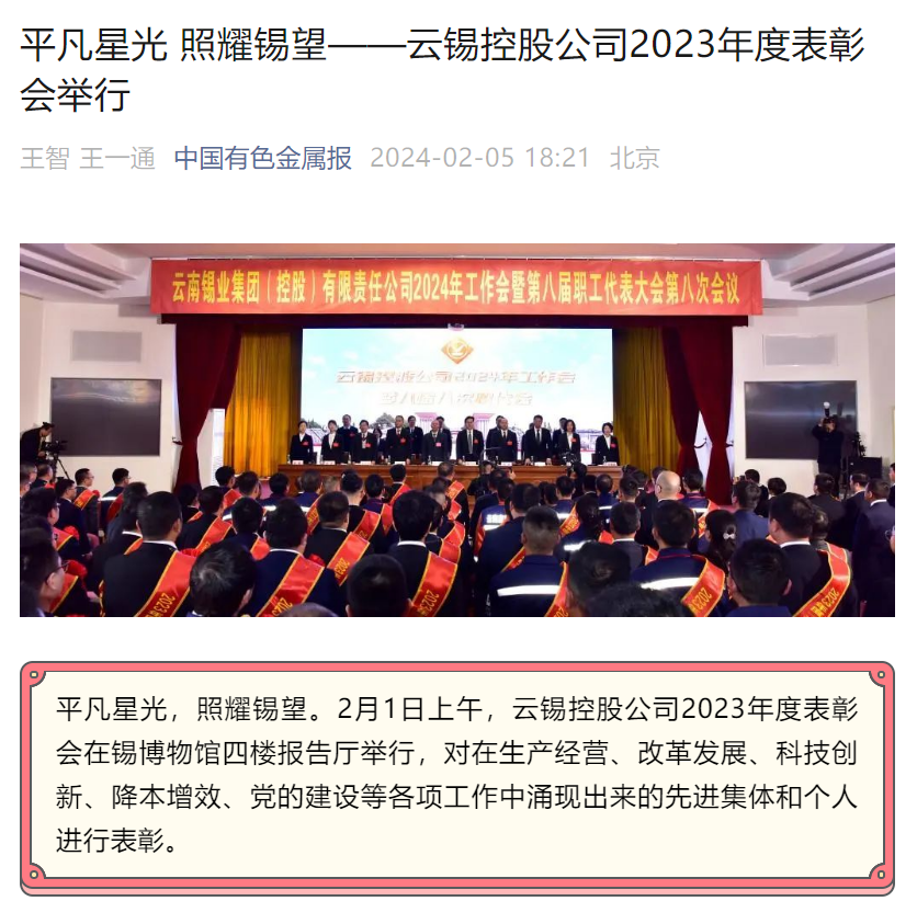云南網、云南政協報、中國有色金屬報:云錫控股公司舉行2023年度表彰會